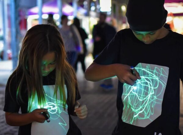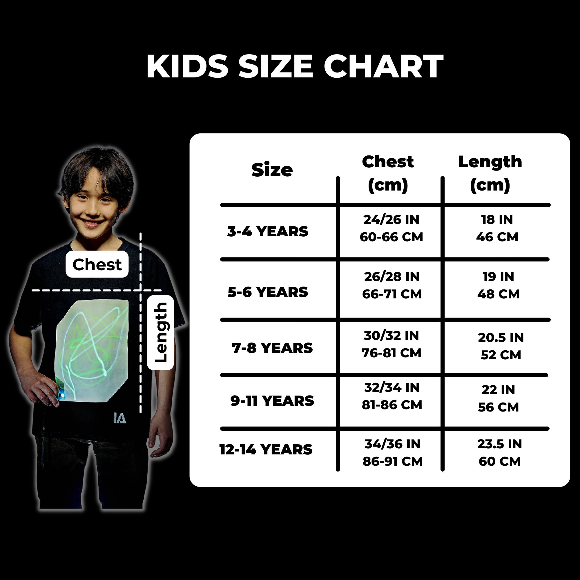 A unique interactive glow t-shirt for children; Using the included Glow Pen or a mobile phone torch you can create your own designs on the clothing – again and again! They are perfect for everyone – whether you’re at a festival, at home with the family, out with the friends, and kids love it too! Makes the perfect gift!