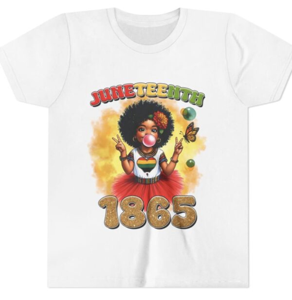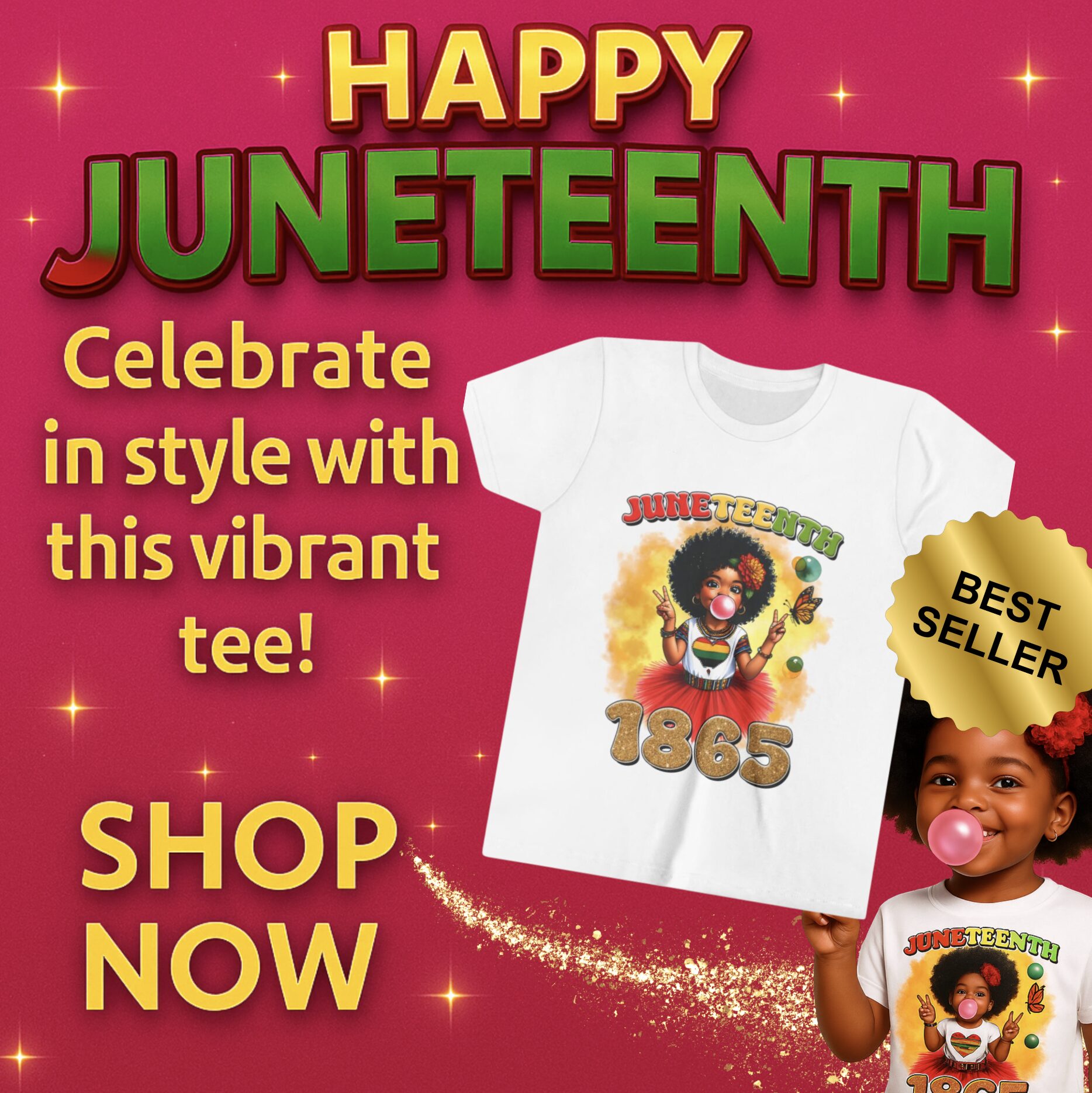 A Juneteenth themed kids t-shirt designed for girls, perfect for celebrating the holiday and promoting awareness. Made with extra lightweight, soft cotton for a comfortable fit. Ideal for parents looking to educate their children on important historical events.