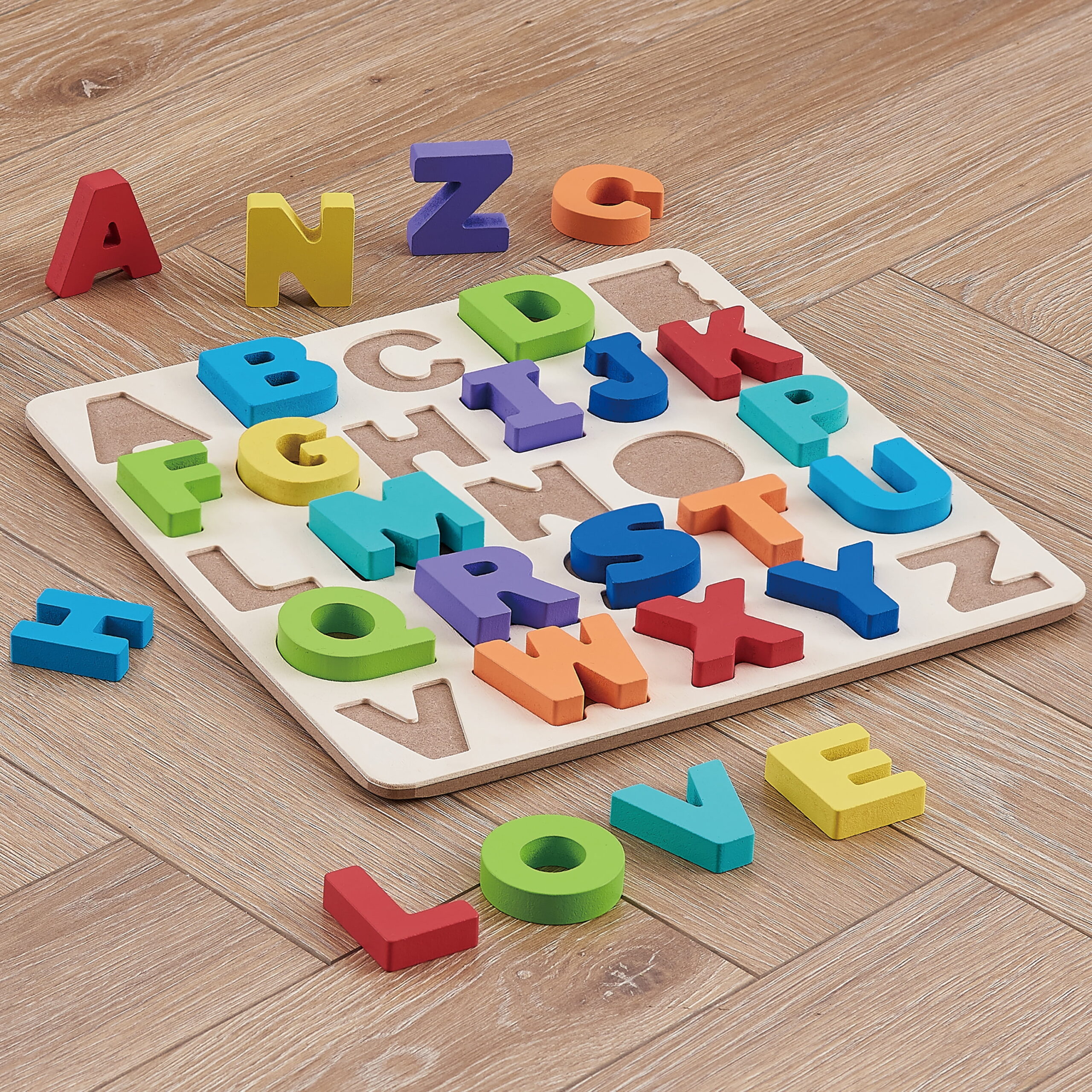 • Includes a wooden puzzle board for letter storage when not in use