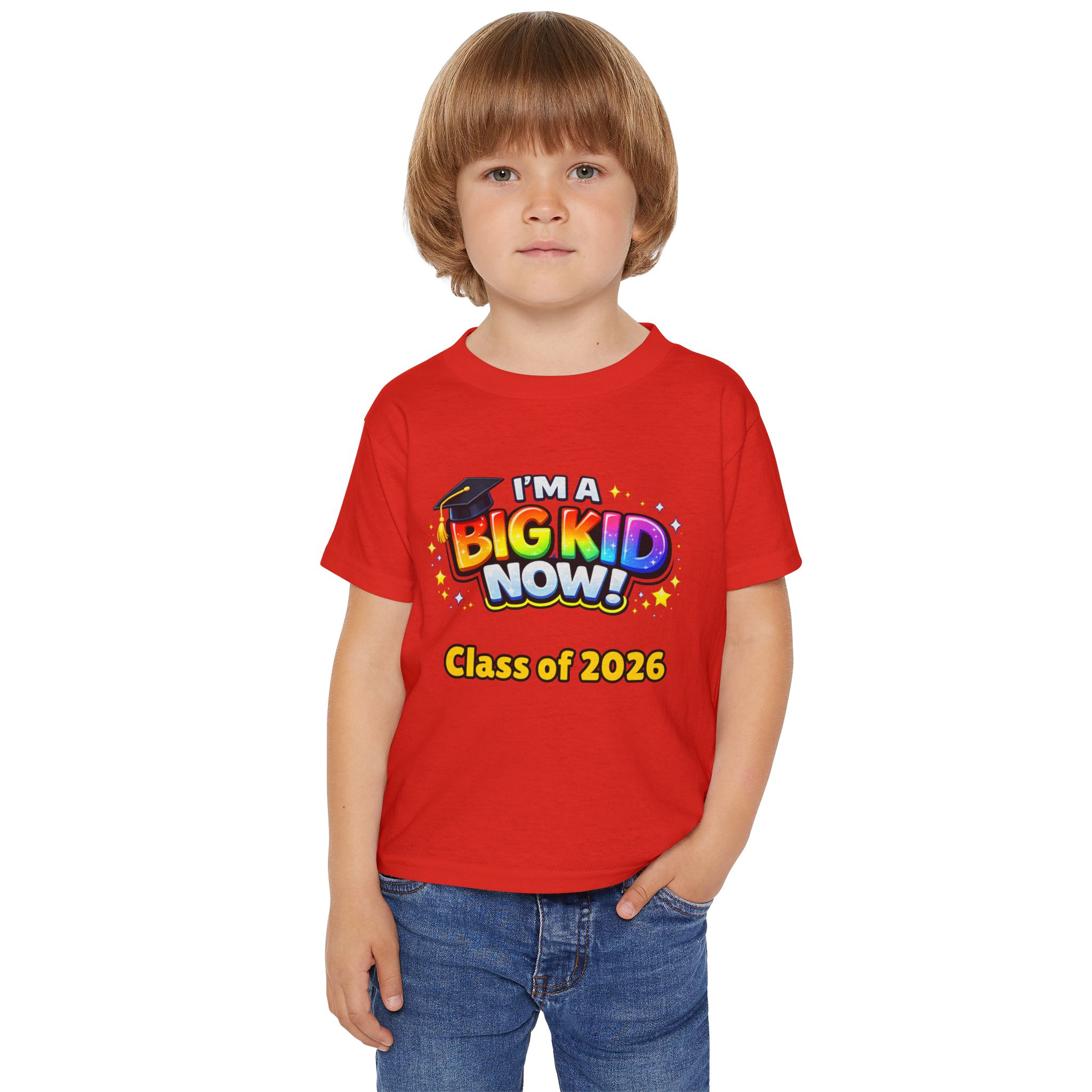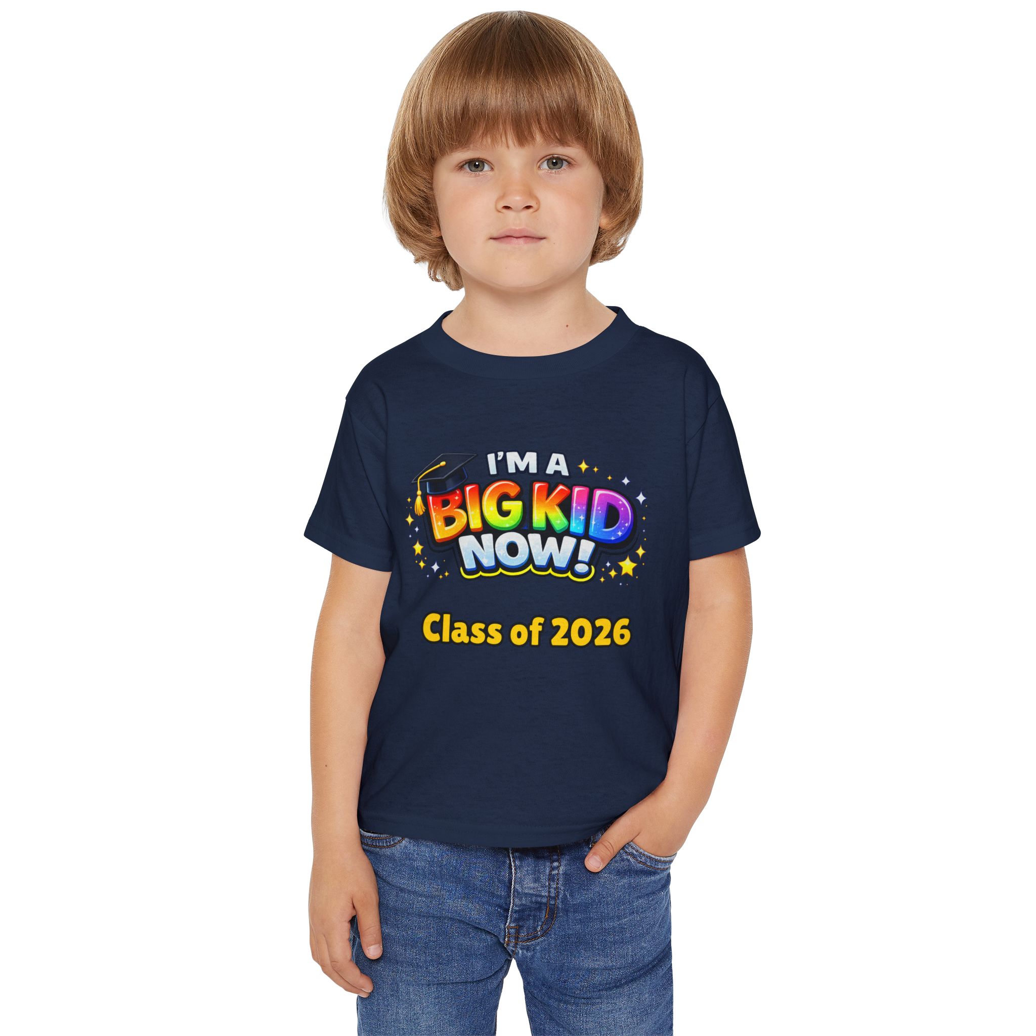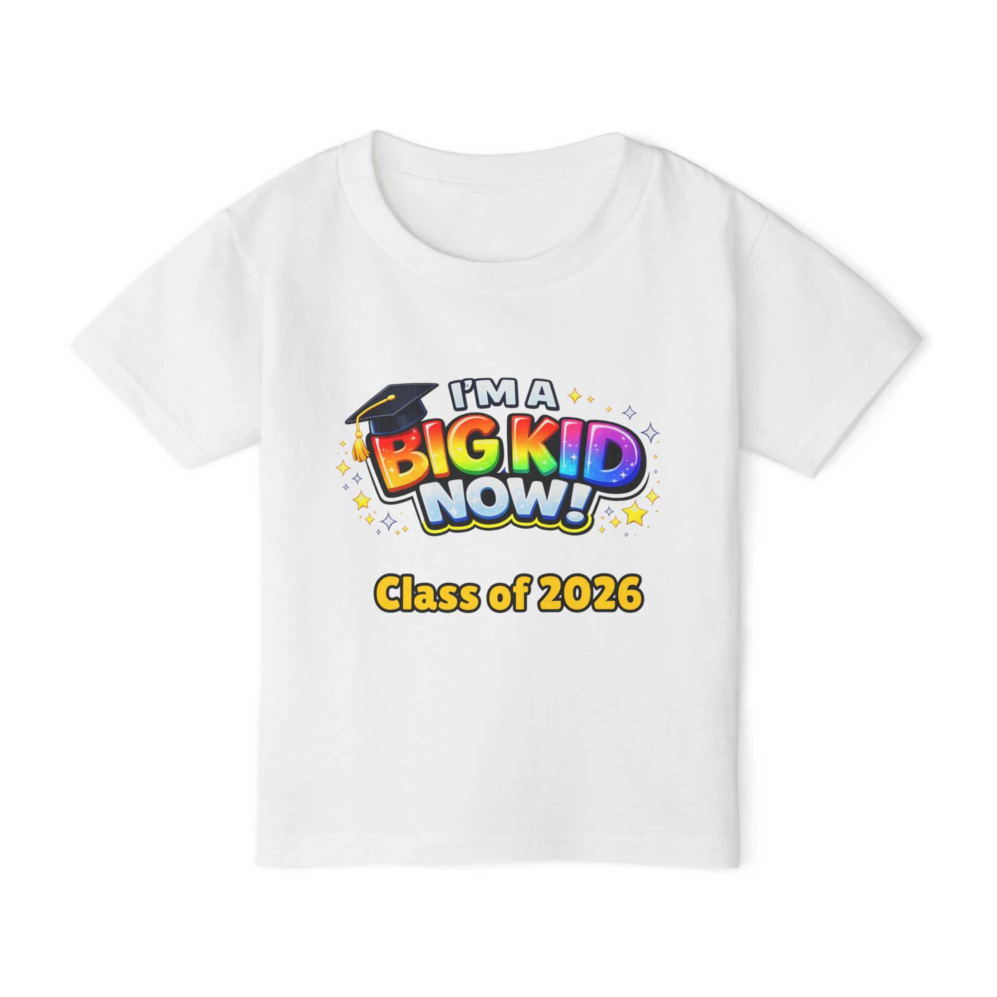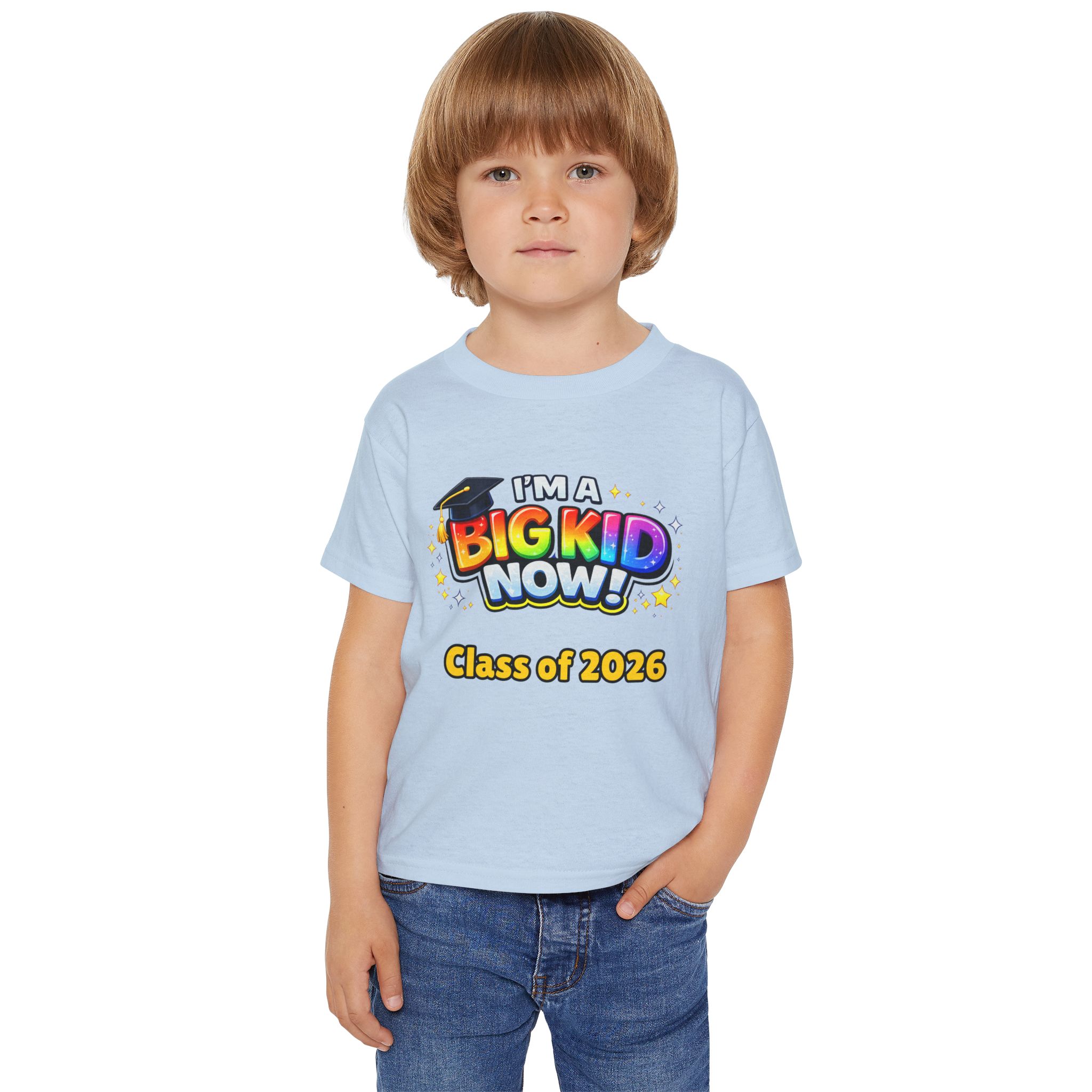 Bright, cheerful toddler tee celebrating a preschool/kindergarten milestone. Soft, medium-weight cotton feels gentle on little shoulders while the colorful “I’m a BIG KID NOW! Class of 2026” graphic puts the spotlight on a proud moment — the first day of school, graduation ceremony, or family photo. The classic fit and ribbed collar make dressing quick and fuss-free. Finished with twill neck-and-shoulder tape and side seams for shape retention, this shirt is built to handle playful days and repeated washings. Use it to mark a child’s transition with joy and a bit of sparkle.