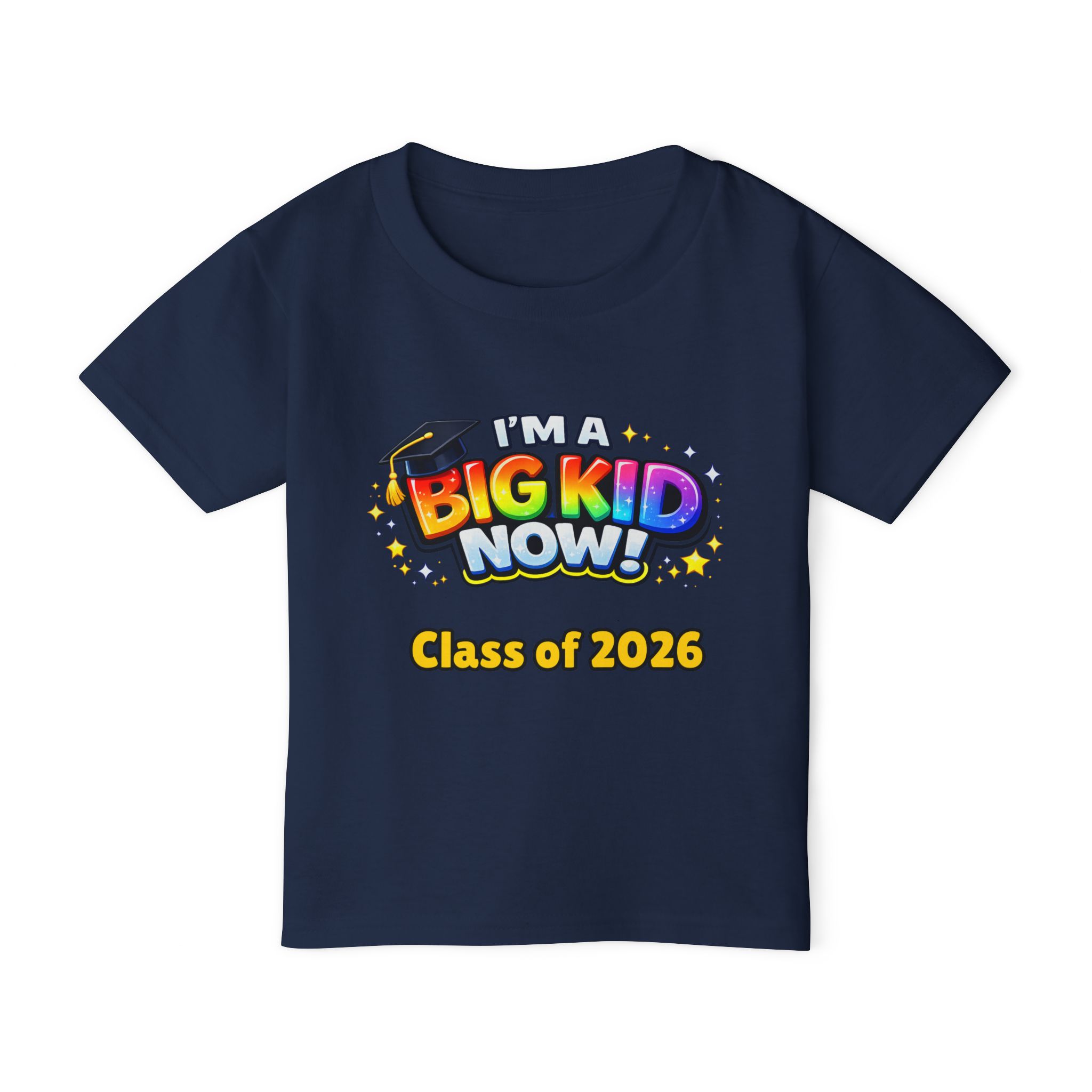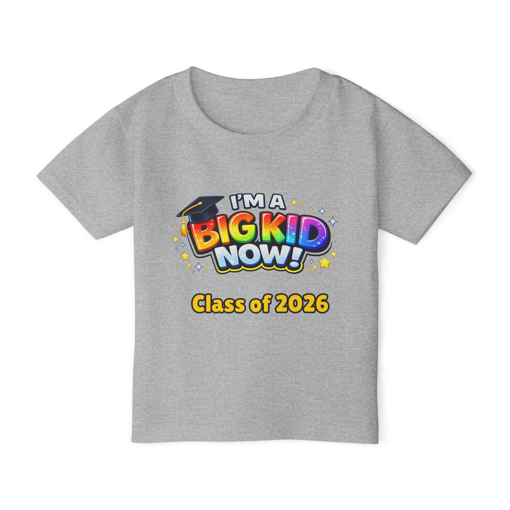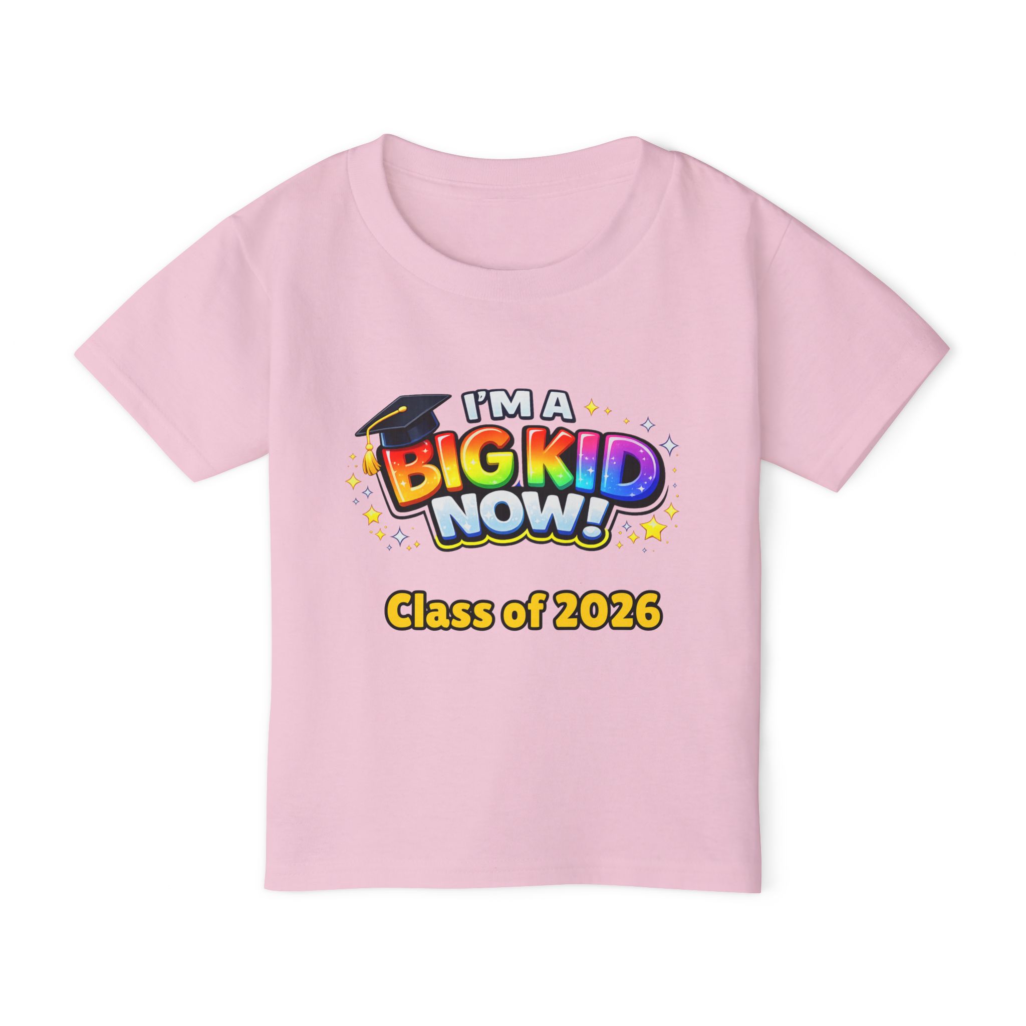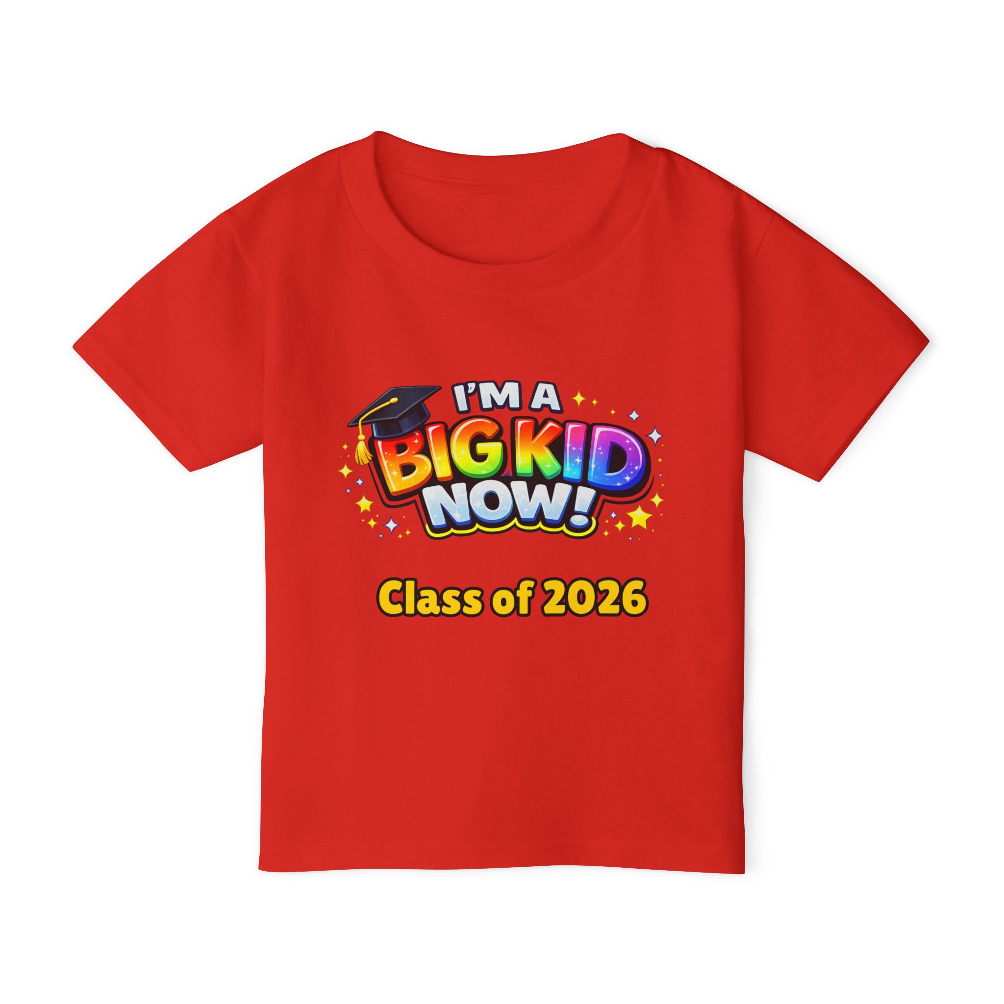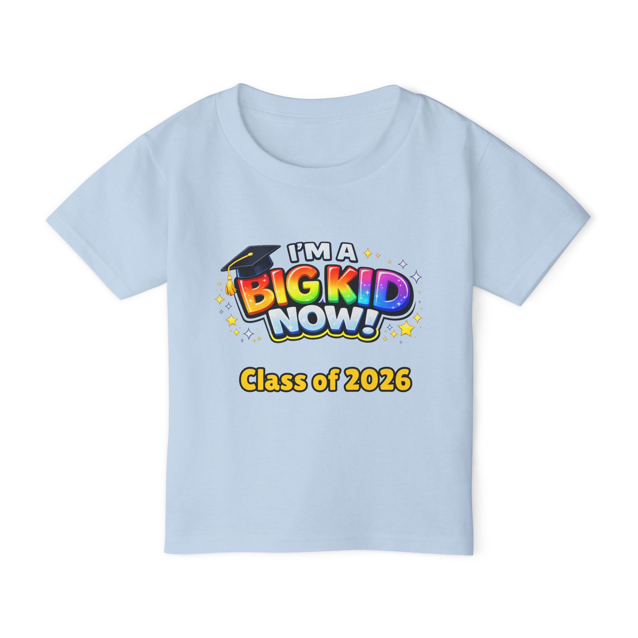 Bright, cheerful toddler tee celebrating a preschool/kindergarten milestone. Soft, medium-weight cotton feels gentle on little shoulders while the colorful “I’m a BIG KID NOW! Class of 2026” graphic puts the spotlight on a proud moment — the first day of school, graduation ceremony, or family photo. The classic fit and ribbed collar make dressing quick and fuss-free. Finished with twill neck-and-shoulder tape and side seams for shape retention, this shirt is built to handle playful days and repeated washings. Use it to mark a child’s transition with joy and a bit of sparkle.